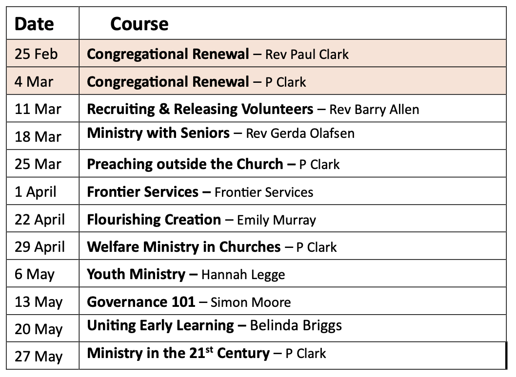 This semester we’re offering a rich line-up of practical topics including congregational renewal, recruiting volunteers, ministry with seniors, youth ministry, governance, preaching beyond the church, creation care, welfare ministry and more.